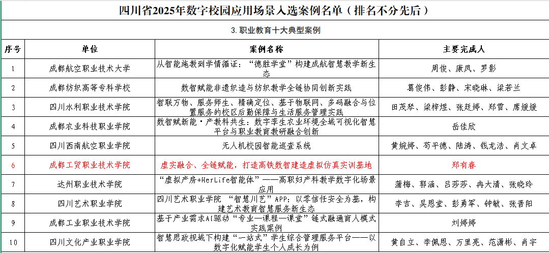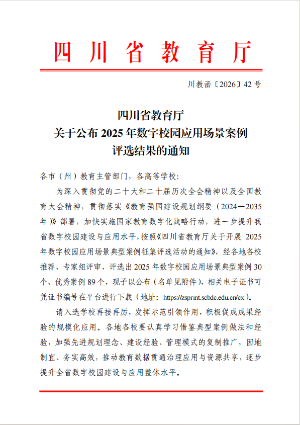 近日,从四川省教育厅《关于公布2025年数字校园应用场景案例评选结果的通知》(川教函〔2026〕42号)获悉,我校组织遴选和推荐的3项案例成功入选,入选数量位居全省职业院校前列,充分展示了我校在数字化转型与智慧校园建设方面的阶段性成果。