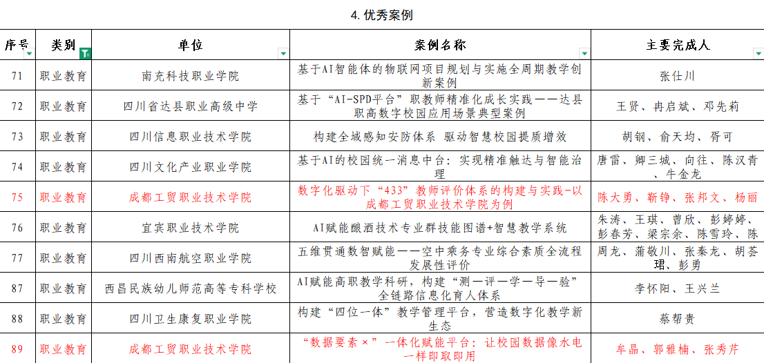此次入选的案例涵盖教学科研、教育评价与管理服务三大关键领域。其中,铁道工程学院报送的《虚实融合、全链赋能,打造高铁数智建造虚拟仿真实训基地》荣获“职业教育十大典型案例”;质量管理办公室报送的《数字化驱动下“433”教师评价体系的构建与实践——以成都工贸职业技术学院为例》与信息工程学院报送的《“数据要素×”一体化赋能平台:让校园数据像水电一样即取即用》双双入选“职业教育优秀案例”。